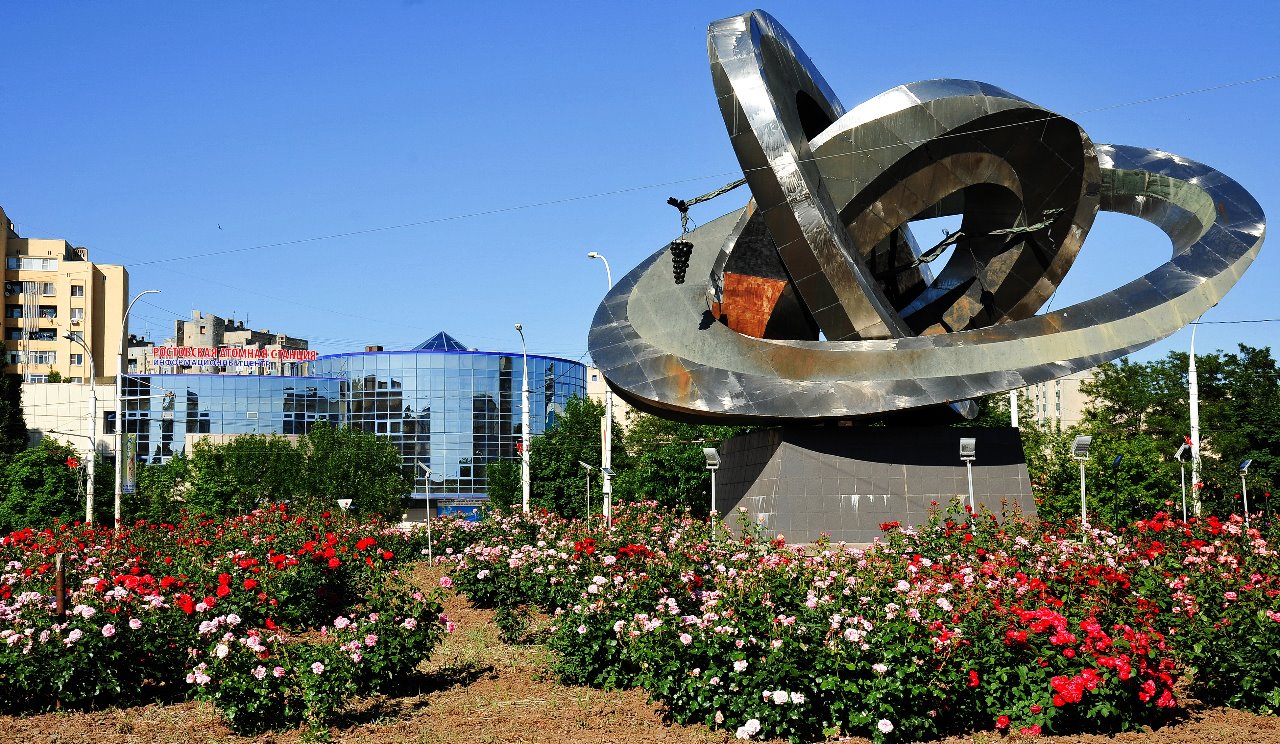 Памятник мирному атому — визитная карточка Волгодонска. Основа композиции —стилизованные орбиты электронов атома, оплетенные виноградными лозами, что напоминает о богатых виноградарских традициях края. Заказ на изготовление каркаса, облицовки из нержавеющей стали и латунных деталей (лозы и гроздей винограда), получил завод «Атоммаш».