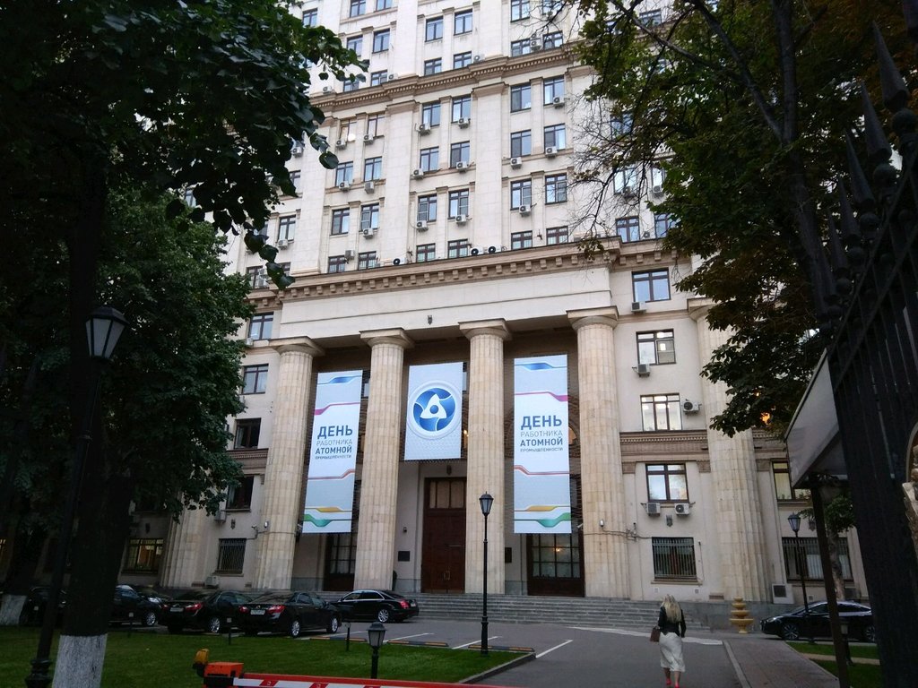 Любопытный факт: в 1854 году на том самом месте, где сегодня стоит здание Росатома, предприниматель, общественный деятель и известный меценат Иван Артемьевич Лямин, построил особняк с домовой церковью Спаса Нерукотворного образа. В начале двадцатого века его вдова Елизавета Семеновна передала особняк Московскому общественному управлению под приют. Так что когда-то здесь находилось убежище для беспризорных детей и престарелых женщин.